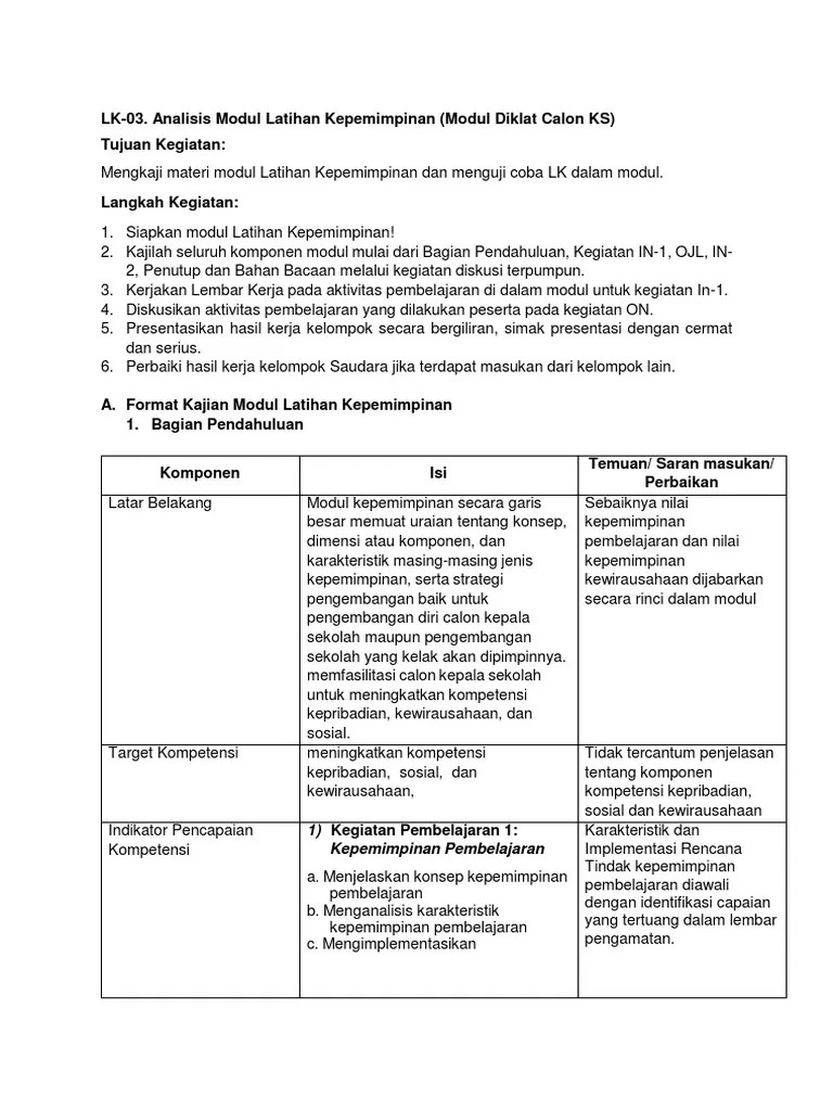 Contoh Lembar Kerja Diklat Cakep Modul Kepemimpinan : Panduan Penilaian Potensi Kepemimpinan Ppk Suaidinmath S Blog : Salah satu tujuan pelatihan untuk kepala sekolah pada materi kepemimpinan pembelajaran, manajemen perubahan dan budaya sekolah, kepala sekolah dapat merumuskan .